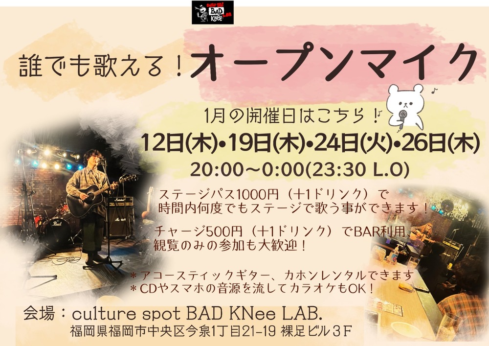 オープンマイク(ステージ)参加の方:ステージパス¥1,000+1ドリンク