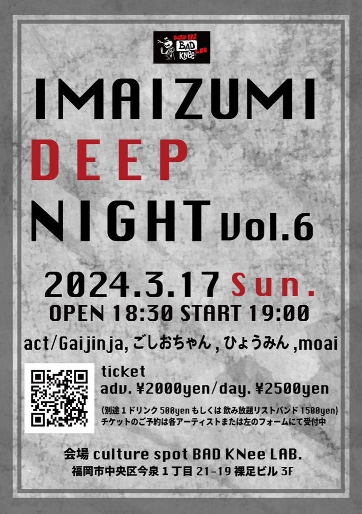 今泉スクランブル!-Episode.51- BAD KNee LAB. SCHEDULE 2024/03/23(土) 18:30 - ■開催日 2024/3/23(土) ■会場 culture spot BAD KNee LAB. ■時間 開場 18:30 / 開演 19:00 ■チケット 前売 ¥2,000/ 当日 ¥2,500 別途ドリンク代 1ドリンク¥500 or 飲み放題¥1,500が必要です。 URLをコピーする 報告する